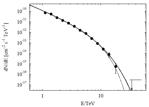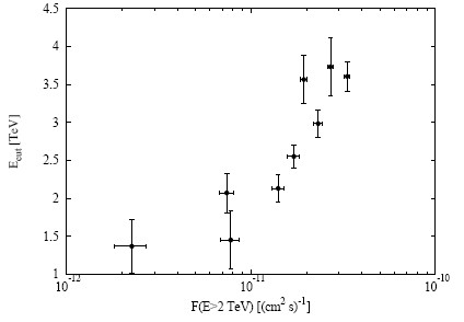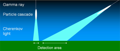 At a declination of 38 degr. N, the northern-hemisphere object Markarian 421 reaches only shallow elevation above ground when viewed from the Namibian H.E.S.S. site (at 23 degr. S); it culminates at an elevation around 30 degr. and has therefore to be observed through a large air mass. What at first sounds like a significant disadvantage has an interesting side effect (top illustration): since the particle cascade generating the Cherenkov light is much further from the telescopes than usual, the light spreads out and covers a much larger area on the ground. The resulting lower intensity of Cherenkov light implies that the energy threshold of the instrument is increased by a factor 10, from about 100 GeV for observations near zenith to about 1 TeV. However, since the Cherenkov light is so spread out, the area over which showers can be detected increases to two square kilometers, with a corresponding gain in detection rates. Observations at low elevations therefore allow one to measure the high-energy part of the spectrum with improved precision (see also Tanimori et al. 1994, Krennrich et al. 1999). The energy spectrum determined with H.E.S.S. (Fig. 1) extends from 1 TeV to well beyond 10 TeV. At the high-energy end, it shows deviations from the usual power-law spectra, indicating that the acceleration process “runs out of steam” or that particles there lose their energy faster – e.g. by synchrotron radiation – than the acceleration mechanism can supply. The energy of the spectral break varies with the gamma-ray flux (Fig. 2); an explanation is that the high-flux states are caused by fresh injection of high-energy particles which then lose their energy, resulting in a reduction of both the gamma-ray flux and the energy of the break. Similar variations were observed in earlier episodes (Krennrich et al. 2002, Aharonian et al. 2002)