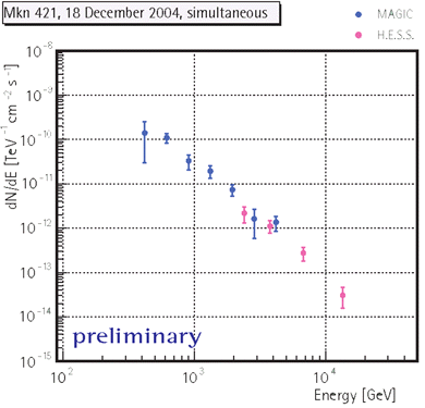 Wide spectral coverage is important to understand and model the processes in the source. An interesting technique to combine results from different observatories was recently explored for the first time: the H.E.S.S. and MAGIC Cherenkov instruments observed Markarian 421 simultaneously, H.E.S.S. at low elevation, covering high energies, and the La Palma based MAGIC instrument at higher elevation, covering the low-energy part of the spectrum (Fig. 3). Such combined observations may ultimately allow to extend spectral coverage of short flares by about one order of magnitude and a joint MAGIC/H.E.S.S. working group has been set up coordinate observations.