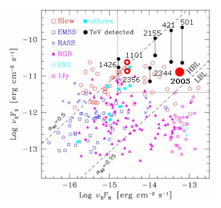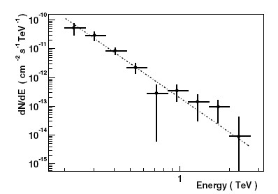 The winter months are the main observing season for extragalactic objects for H.E.S.S., hence we will here and in the next SOM’s concentrate on extragalactic sources of TeV gamma rays. PKS 2005-489 is in a certain sense of historical interest, being the first active galactic nucleus (AGN) newly discovered by H.E.S.S., based on data partly taken during the commissioning phase with two and three telescopes. The object was selected as an interesting candidate for observation on the basis of its high flux in X-rays and at radio wavelengths (Fig. 1), both tracers of high-energy electrons. H.E.S.S. observations resulted in a detection with a significance of 6 standard deviations (Fig. 2), sufficiently strong to derive an energy spectrum (Fig. 3). Attempts to detect the object with previous instruments had failed (Roberts et al. 1999, Nishijima et al. 2002, Chadwick et al. 2000), which is not surprising given its small gamma ray flux, of only 2.5% of the Crab Nebula flux. During the H.E.S.S. observations, X-ray activity of PKS 2005-489 was rather low in comparison to earlier times (e.g. 1998), implying that the AGN was in a low-emission state. Given its relatively modest redshift of 0.071, the steep energy spectrum appears to be an intrinsic feature of the source – the acceleration engine running out of steam – opposed to effects caused by gamma-ray absorption due to interactions with photons in extragalactic space, which preferentially remove high-energy particles.