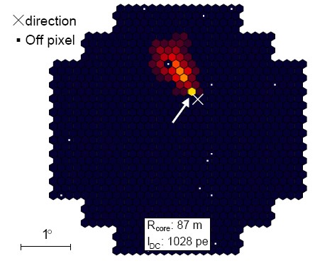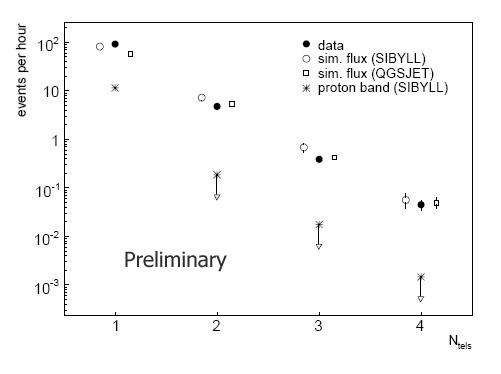 In total, 357 hours of H.E.S.S. data taken between 2004 and 2006 at small zenith angles were searched for the characteristic signature of direct Cherenkov emission from heavy nuclei: a concentrated very bright light spot at the head end of the extended shower image. Among these data, 1899 events were selected with the appropriate signature detected simultaneously in at least two telescopes. Fig. 1 shows a typical “direct Cherenkov” event: a single very bright image pixel – containing many 100 photoelectrons – is detected in close angular proximity to the reconstructed axis of the air shower, followed by a broad trail of air shower emission pointing away from the shower axis. As predicted, such events are only detected when the telescope is relatively close to the trajectory of the primary particle – about 70 to 120 m. A question is, of course, if such a signature could be faked by statistical fluctuations in normal images. On the basis of simulations, one expects about 10 background events per hour when the “direct Cherenkov light” signature is requested in a single telescope, already well below the detected rate of about 100 such events each hour. Final confirmation comes from events where the primary particle is detected simultaneously in 2, 3 or even 4 telescopes (Fig. 2); there, backgrounds are predicted to be completely negligible. As mentioned above, the H.E.S.S. analysis is based on the 1899 events where the primary nucleus is seen in at least two telescopes. Since such coincidences can only be seen when all telescopes happen to be at the right distance from the trajectory of the cosmic ray, the detection rate drops by about a factor 10 for each additional telescope. The charge resolution of the technique is not perfect, but is sufficient to identity and separate iron-like elements among cosmic rays and to determine their flux (Fig. 3). The new measurement is consistent with previous results and is more precise. The measured spectral index for iron nuclei in the 10 to 100 TeV energy range – 2.7 to 2.8 – agrees with the index of the overall cosmic ray spectrum, indicating that in this range the fraction of heavy elements among cosmic rays is roughly constant. Limited statistics currently prevent extension of the spectrum into the “knee” region where a change in composition is expected. As discussed byKieda et al. (2001), a dedicated instrument with even finer image pixels and nanosecond temporal resolution could further improve the charge reconstruction. However, the H.E.S.S. results show that the technique is not entirely free of systematic uncertainties related to the shower development: heavy fragments created in the first interaction of the nucleus contribute at reduced level to the “direct” Cherenkov light and the predicted rate of such fragments varies between different air shower models (Fig. 3).