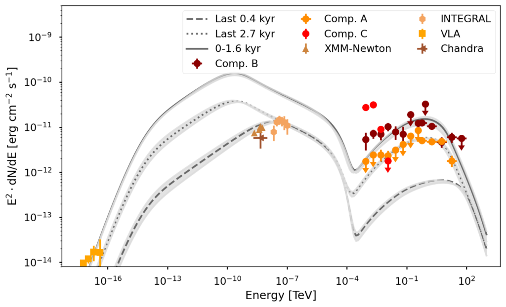 Figure 2: Spectral energy distribution of HESS J1813–178, with data from H.E.S.S. and Fermi-LAT [5], Chandra [6], VLA [7], INTEGRAL [8] and XMM-Newton [9]. Additionally shown as grey curves are model predictions, based on interactions of highly relativistic particles originating from PSR J1813–1749.