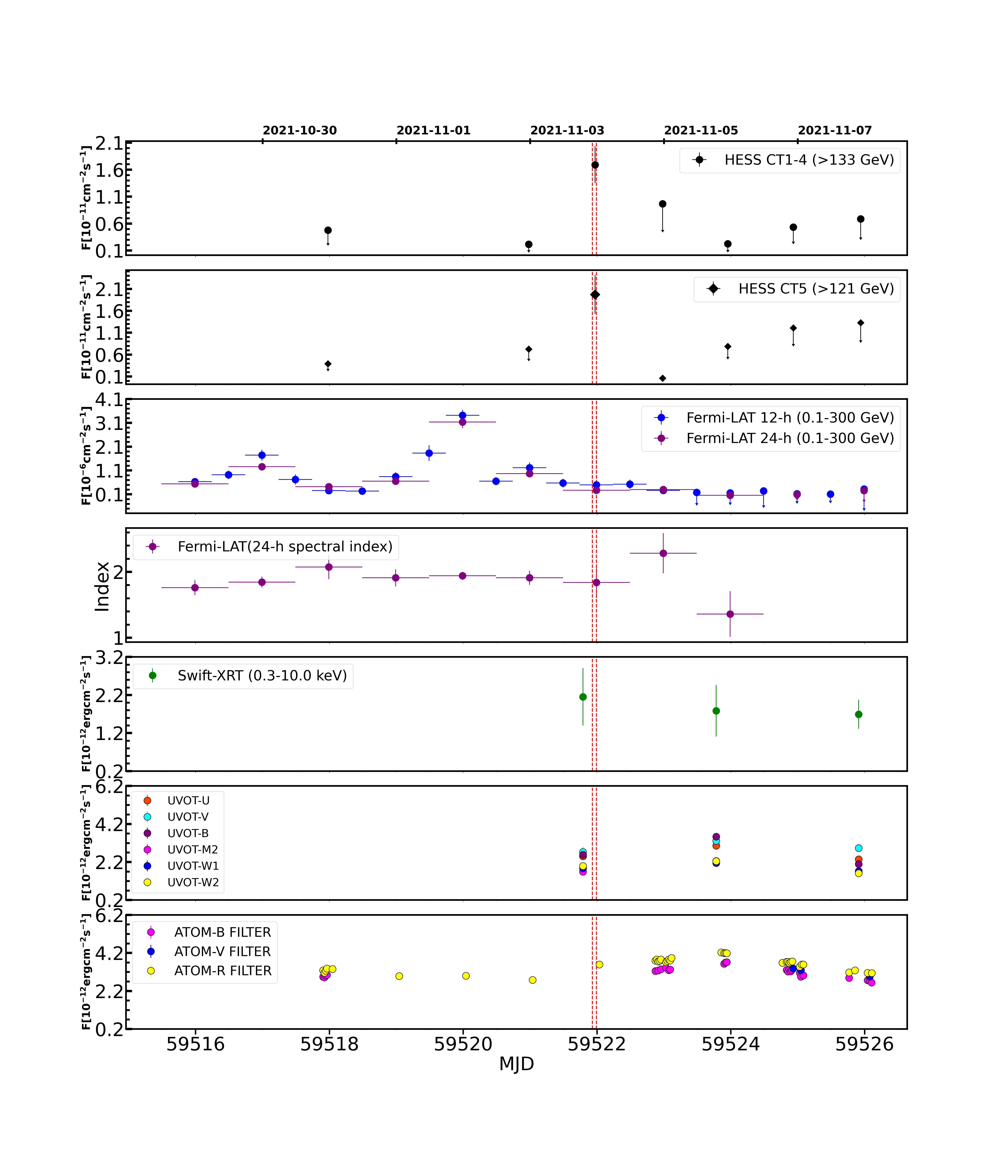 The H.E.S.S. observations were supplemented by multi-wavelength observations with Swift-XRT in X-rays, and the Automated Telescope for Optical Monitoring (ATOM) and Swift-UVOT in the optical and UV bands. Figure 2 shows the multi-wavelength light curves. Due to bad weather, no H.E.S.S. observation was possible during the two HE γ-ray lightcurve peaks detected with Fermi on October 30 and November 1 (third panel). Notably, when the source was flaring in the VHE band on November 3 (H.E.S.S. data, top 2 panels), the HE γ-ray lightcurve showed the source already back in quiescence, i.e., the VHE γ-ray flare was not coincident with flaring in the adjacent HE γ-ray band. Such a delayed VHE γ-ray flaring behavior is very difficult to reconcile with the simplest blazar emission models, which usually assume just one dominant emission region in the jet responsible for the entire emission.