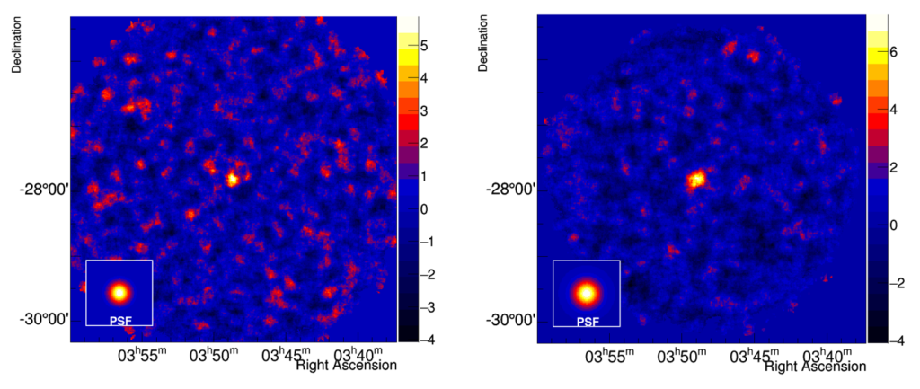 As part of this high-z blazar target-of-opportunity (ToO) programme, H.E.S.S. observed the z = 0.991 FSRQ PKS 0346–27 from 30 October to 8 November 2021, in response to a flare alert from Fermi-LAT. These observations led to a significant detection of the blazar [3], making PKS 0346–27 the most distant blazar ever detected with a ground-based γ-ray observatory at the time. The source was only detected in one night, namely on 3 November 2021. Figure 1 shows the significance maps for both the CT1-4 (the four 12-m diameter telescopes) and the CT5 (the 28-m diameter telescope) datasets on the detection night.