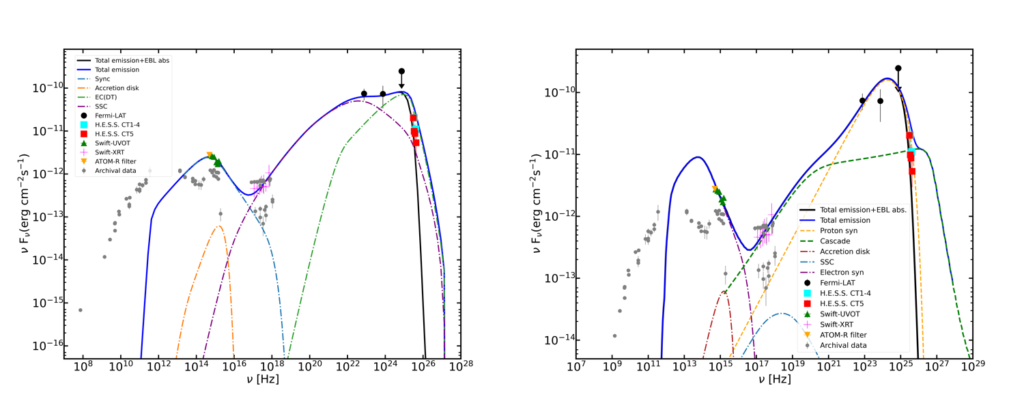 When modeling the SEDs of blazars, one usually starts out with the simplest possible model with the fewest number of free parameters, which is a single-zone leptonic model. Although a satisfactory fit with a leptonic model was, in principle, possible (left panel of Fig. 3), it required extreme values of parameters, not usually found in FSRQs, such as very high Doppler and bulk Lorentz factors of ~80 and a very low magnetic field, leading to the jet having a very low magnetization, which leads to problems with keeping the particles confined within the jet. Alternatively, a satisfactory fit to the SED could be obtained with a single-zone hadronic model (right panel of Fig. 3) with parameter values compatible with other blazars. Therefore, a hadronic fit is considered to be preferred for PKS 0346–27.