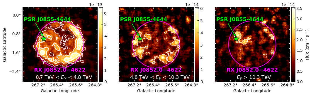 Fig. 1: TeV gamma-ray flux map (cm−2 s−1 ) of the Vela Junior region in three different energy bands. A smoothing radius of 0.1° is used. The Vela Junior SNR is indicated by the magenta circle and PSR J0855−4644 is indicated by the green star. The significance contours of the TeV gamma-ray emission at the 5, 10, and 20σ levels are shown in white, with increasing line width for increasing significance.