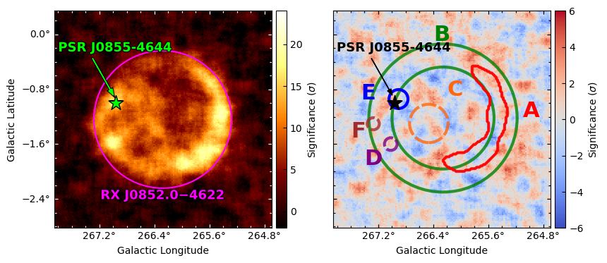 Fig. 2: Significance maps of gamma-ray emission above 0.7 TeV. Left: Significance map with Vela Junior indicated by the magenta circle and PSR J0855-4644 indicated by the green star. Right: Residual significance map with the six model components shown in different colours.