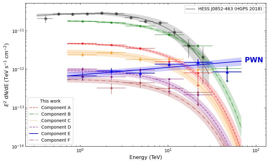 Fig. 3: Spectral energy distribution for each H.E.S.S. component. The components from this work are shown from “A” to “F”, in red (dashed), green (dot dashed), orange (dotted), purple (dashed), blue (solid) and maroon (dot dashed), respectively. The flux points are derived individually from each of the respective models. These spectra are compared to the result from HESS J0852−463 in solid black from [1].