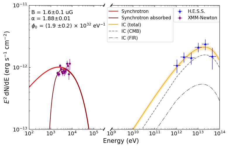 Component E spatially overlaps with PSR J0855−4644 (see Fig.2), suggesting a potential physical association. This interpretation is supported by the detection of a PWN at X-ray wavelengths with XMM-Newton [6] and a radio nebula [9], both at the same location as component E. The spectral index of component E is hard (ΓE ∼ 1.8), which is consistent with expectations from the inverse-Compton (IC) emission from an energetic PWN. A joint multi-wavelength fit is performed across both the X-ray and gamma-ray wavelengths utilising Naima and XSPEC in the Gammapy framework. This is a full forward modelling technique (not flux point fitting). This one leptonic joint fit leads to a lower limit on the magnetic field of 1.6µG and a spectral index of α = 1.88 ± 0.01 (Fig 4). This is in line with expectations of PWN, as they are expected to exhibit a hard spectral index (i.e. see [10, 11]).