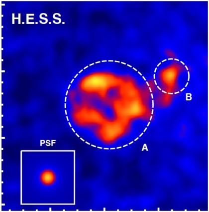 October 2010 New very high energy gamma-ray image of HESS J1731-347, resolving a shell coincident with the radio shell G356.6-0.7 (region A). Outside the shell, a gamma-ray excess of 7.5 sigma significance is seen…