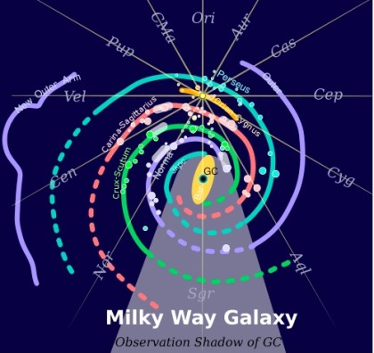 November 2010 Our Galaxy with its spiral arms (from Wikipedia). The distance from the sun (cross of the lines indicating directions of constellations) to the center of the Galaxy is about 8.5 kpc. HESS…