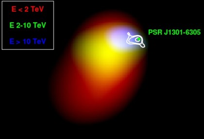 January 2011 Energy mosaic of HESS J1303-631. Red: gamma rays below 2 TeV, green: 2 TeV to 10 TeV, blue: above 10 TeV. The highest energy photons originate nearest the pulsar, PSR J1301−6305 (marked…