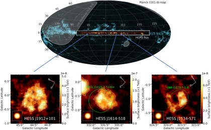 March 2018 Fig 1: Positions of the new TeV supernova remnant shell candidates (shown in the bottom panels) on the H.E.S.S. Galactic plane survey flux map (HGPS, shown at the center of the top…