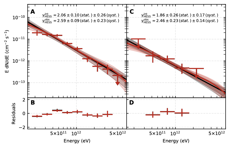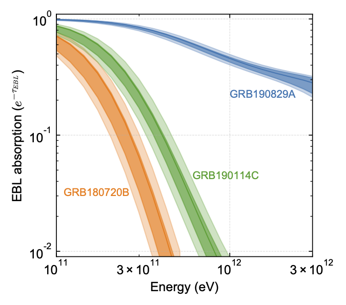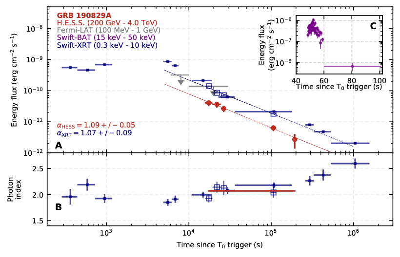 Gamma-ray bursts (GRBs), which are bright flashes of gamma rays from extragalactic sources followed by fading afterglow emission, are associated with stellar core collapse events. We report the detection of very-high-energy (VHE) gamma rays from the afterglow of GRB 190829A, between 4 and 56 hours after the trigger, using the High Energy Stereoscopic System (H.E.S.S.). The low luminosity and redshift of GRB 190829A reduce both internal and external absorption, allowing determination of its intrinsic energy spectrum. Between energies of 0.18 and 3.3 tera–electron volts, this spectrum is described by a power law with photon index of 2.07 ± 0.09, similar to the x-ray spectrum. The x-ray and VHE gamma-ray light curves also show similar decay profiles. These similar characteristics in the x-ray and gamma-ray bands challenge GRB afterglow emission scenarios.