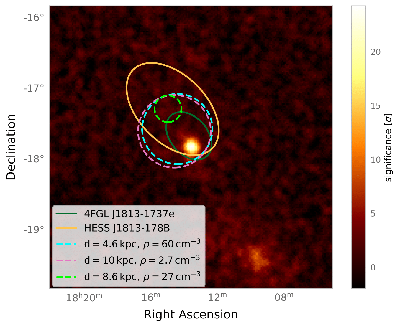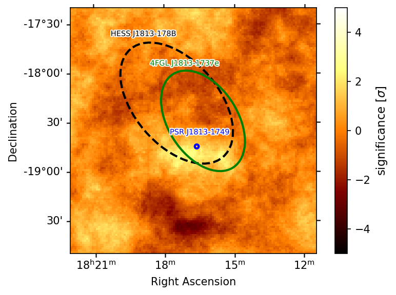 Conclusions. This study suggests that HESS J1813–178 is associated with a γ-ray PWN powered by PSR J1813–1749. A possible origin of the extended emission component is inverse Compton emission from electrons and positrons that have escaped the confines of the pulsar and form a halo around the PWN.