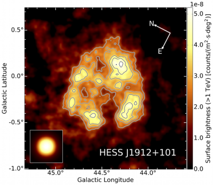 May 2017 Fig 1: TeV surface brightness map of HESS J1912+101 derived with H.E.S.S. [1]. The inset on the bottom left denotes the point spread function of the TeV map. The source displays a…