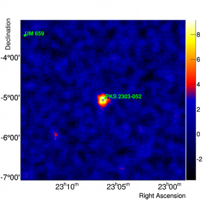 April 2017 Fig 1: A map showing the significance of the emission in the sky region around the quasar PKS 2303-052 (marked by the green cross). Significant gamma-ray emission at the level of 10…