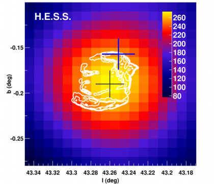 June 2016 Fig. 1: Gamma-ray excess map towards W49B obtained with H.E.S.S. The map is smoothed with a Gaussian kernel of width 0.06deg, corresponding to the 68% radius containment of the H.E.S.S. point spread…