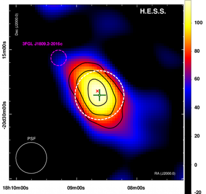 May 2016 Fig. 1: H.E.S.S. gamma-ray image of the VHE source HESS J1808-204 with 6, 5, and 4 sigma statistical significance contours (black solid lines) and intrinsic extension (white dashed circle). Green cross: best…