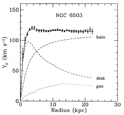 November 2016 Indirect evidence for the presence of dark matter in galaxies: rotation velocity of the stars in the galaxy NGC6503 as a function of distance to the centre (data points). To explain the…