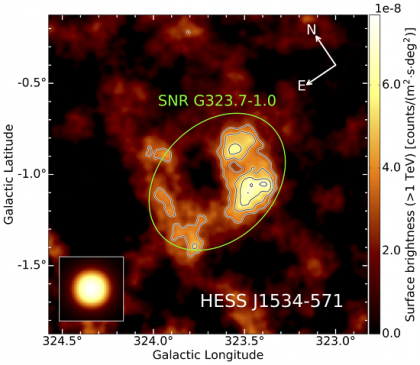 February 2017 Fig 1: TeV surface brightness map of HESS J1534-571 derived with H.E.S.S. The green ellipse denotes the extension of the radio SNR candidate counterpart G323.7-1.0. The inset on the bottom left denotes…